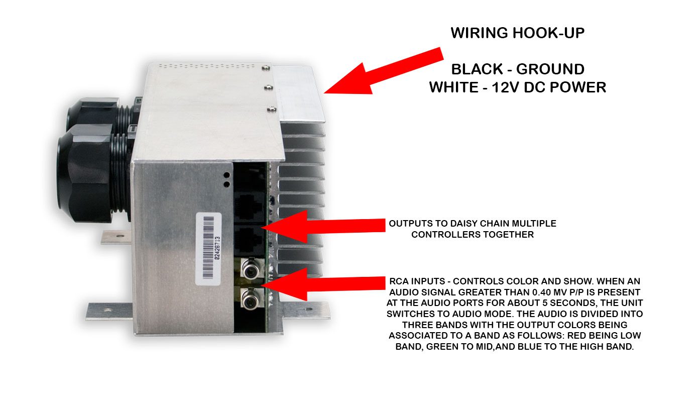 - Audio Input: When an audio signal greater than 0.40 mv p/p is present at the audio ports for about 5 seconds, the unit switches to audio mode. The audio is divided into three bands with the output colors being associated to a band as follows: red being low band, green to mid,and blue to the high band.