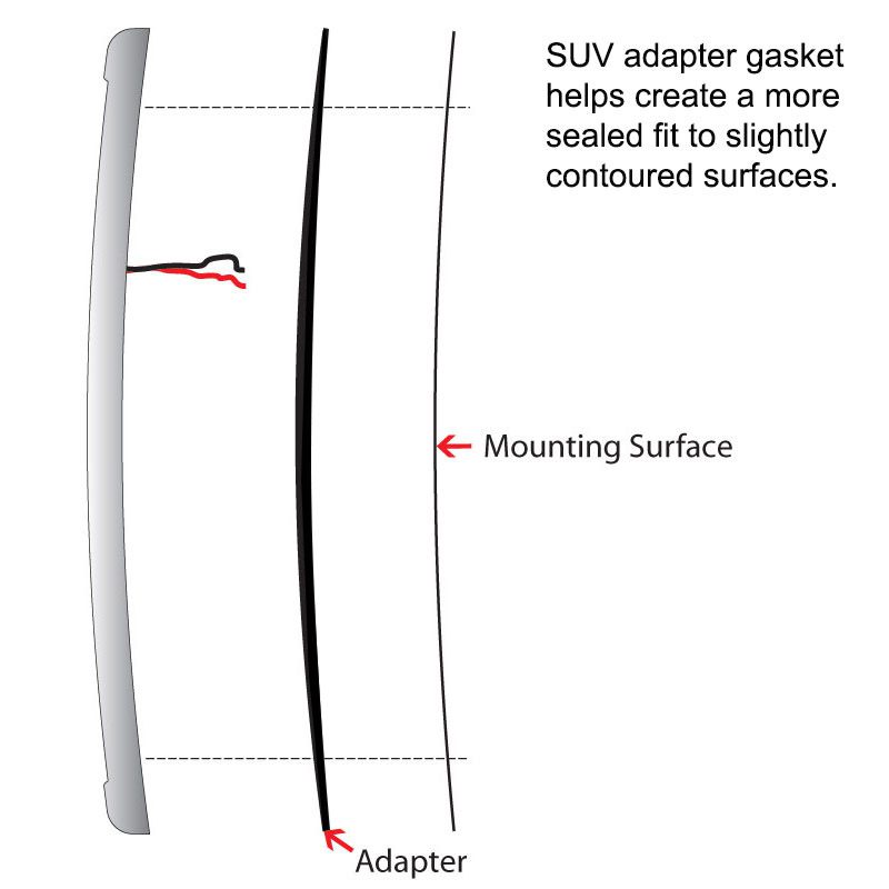 This black rubber adapter is used for sealing gaps when mounting the Model #900 series lights to SUV’s and surfaces with little contour. The light is curved to fit the radius of most modern vehicles. This gasket helps seal your investment. Can be purchased separate or bought together with the light. Compatible with all 900, 902, 920 and 922 series coach lights.