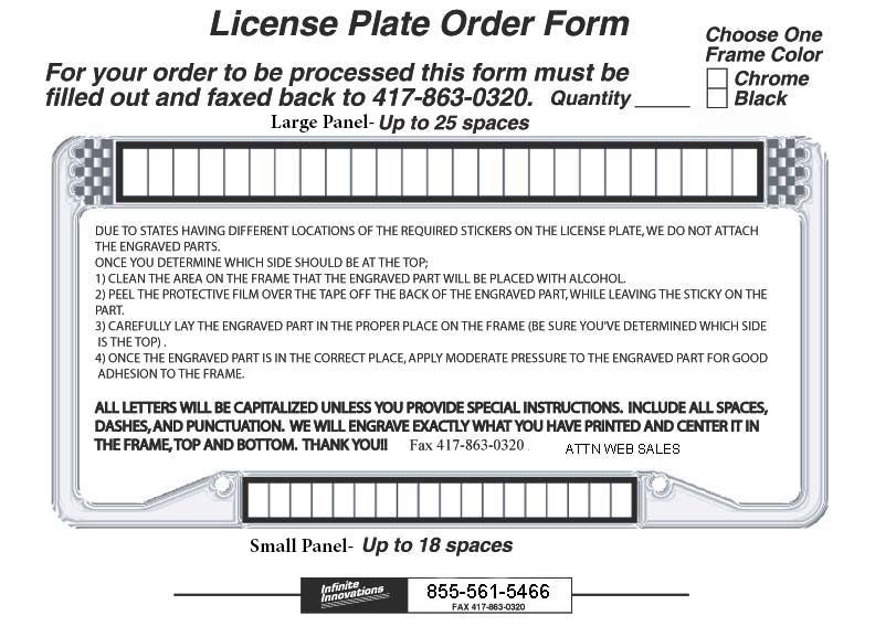 Different states have different requirements for license plates, so we will not attach the engraved panel pieces. We will send them with double-sided tape so you can apply them whichever direction best fits your needs. Please indicate your preference of wording on both the large (up to 25 spaces) and small (up to 18 spaces) panels using the instruction form below or by adding clear instructions as a note on your web order.