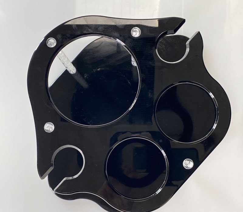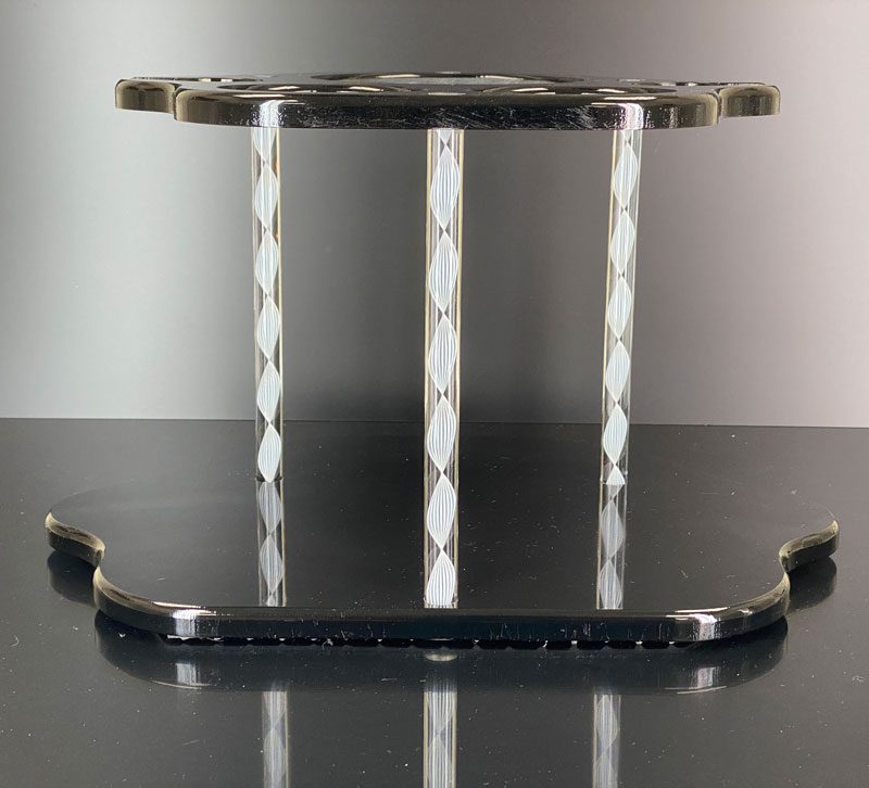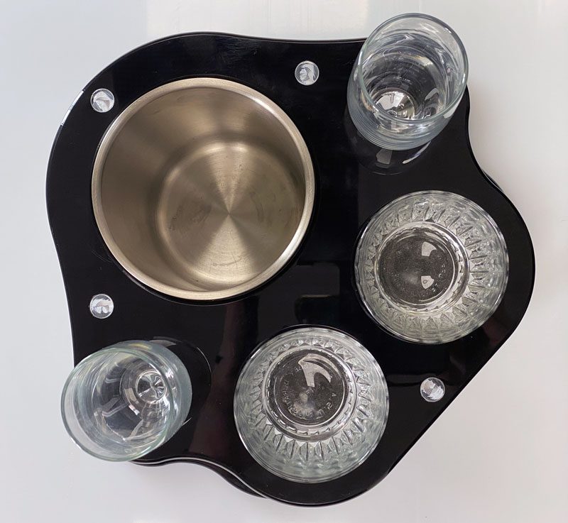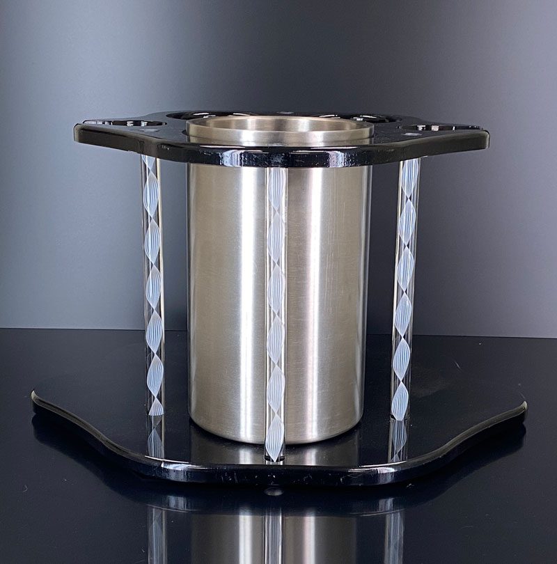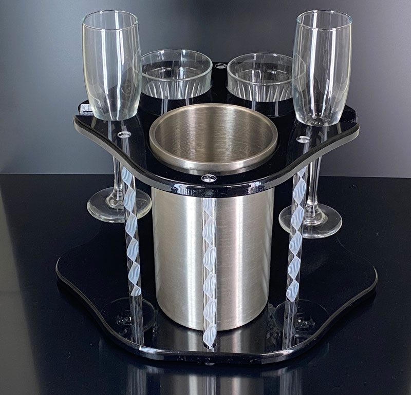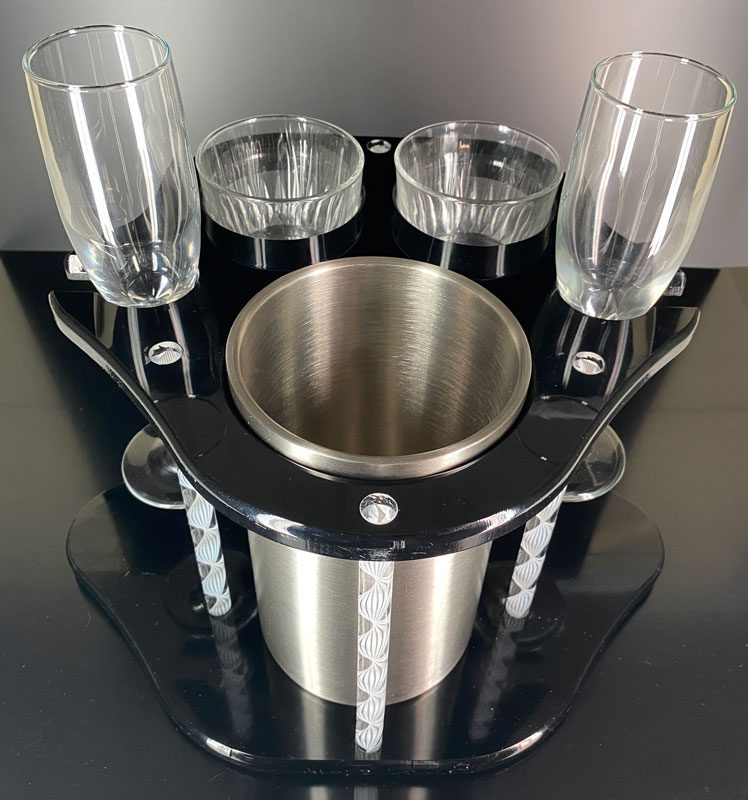 Special high-quality polished black acrylic table. The table sits flat and holds two rock glasses, and two wine or champagne flute glasses, and includes a double-wall stainless steel removable bottle chiller that will keep your pre-chilled bottle frosty cold for hours. Features spiraled design fiber rod accents that would look vibrant in lighting.